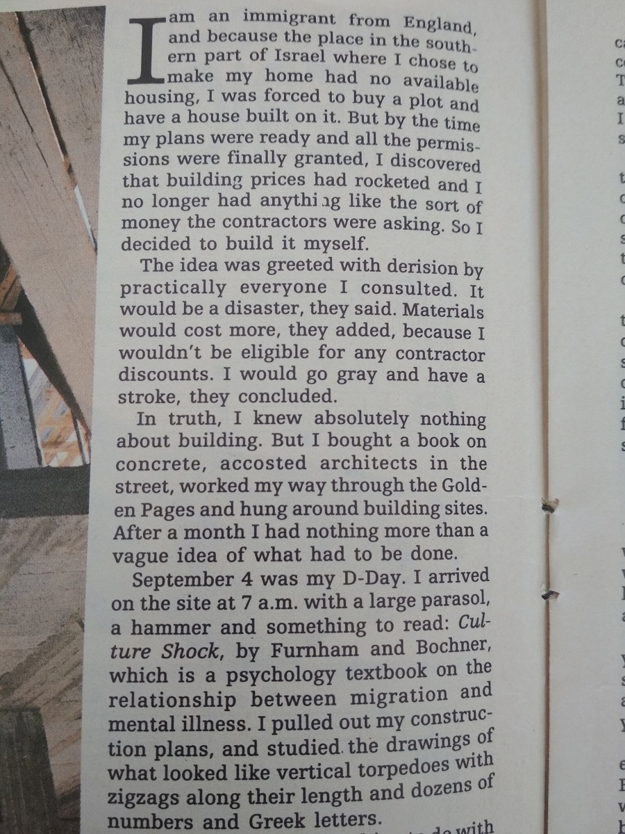 They were selling half-dunam parcels of land for $2000. I borrowed the money from my friend Simon in Paris and bought a plot very close to the cliff.Because I had no job I had a lot of time on my hands, I thought I might try to build the house myself, how complicated could it be? At some point in the process a journalist who happened to be a relative thought this would make a good story; he said that if I wrote it up he would put it in the Jerusalem Post…